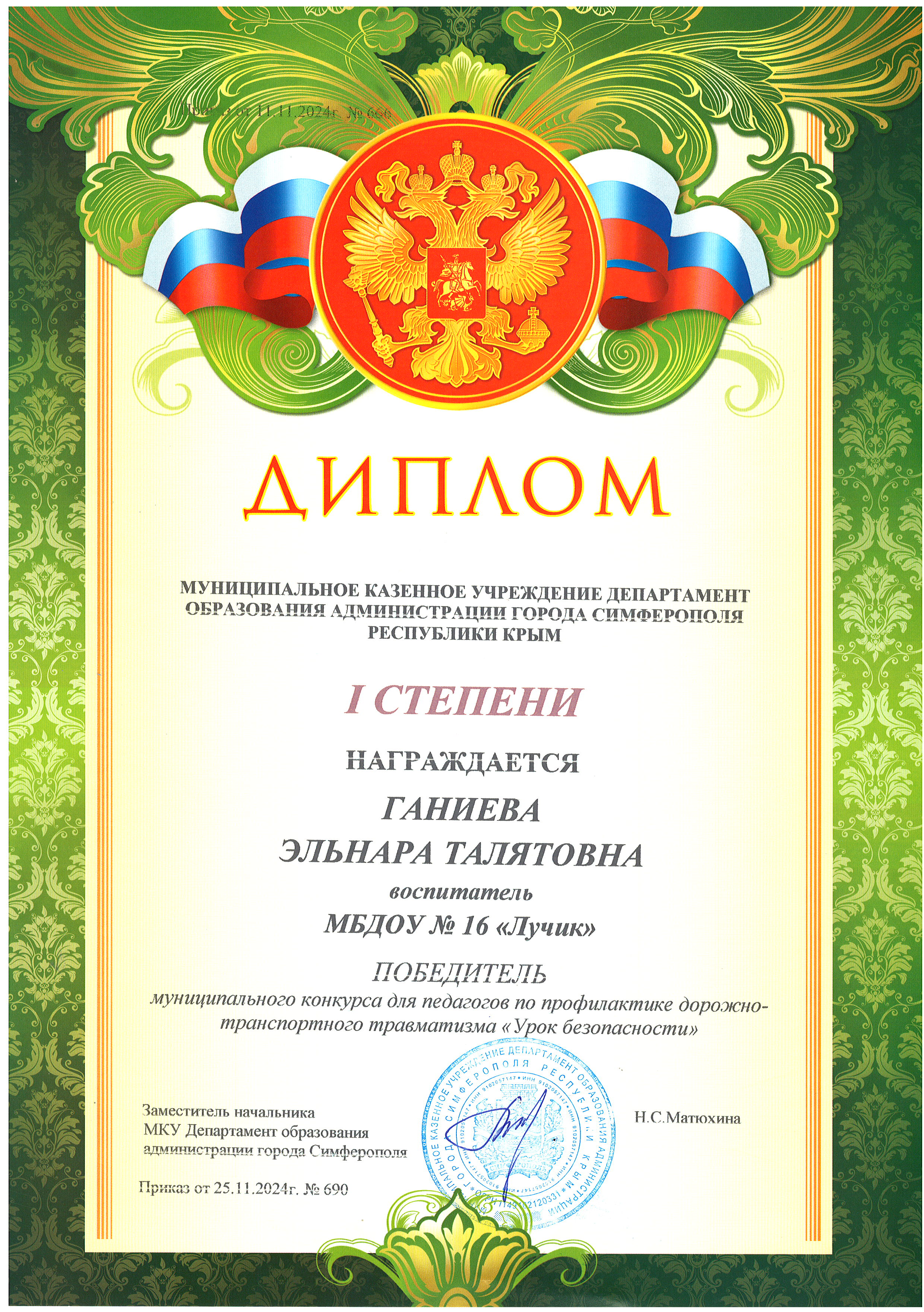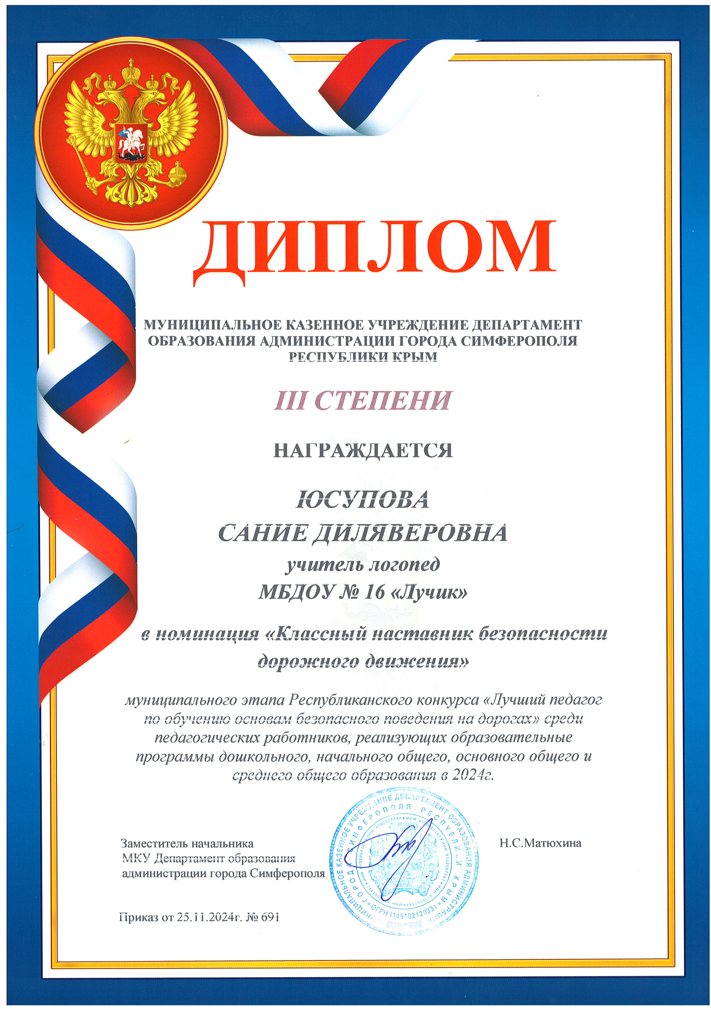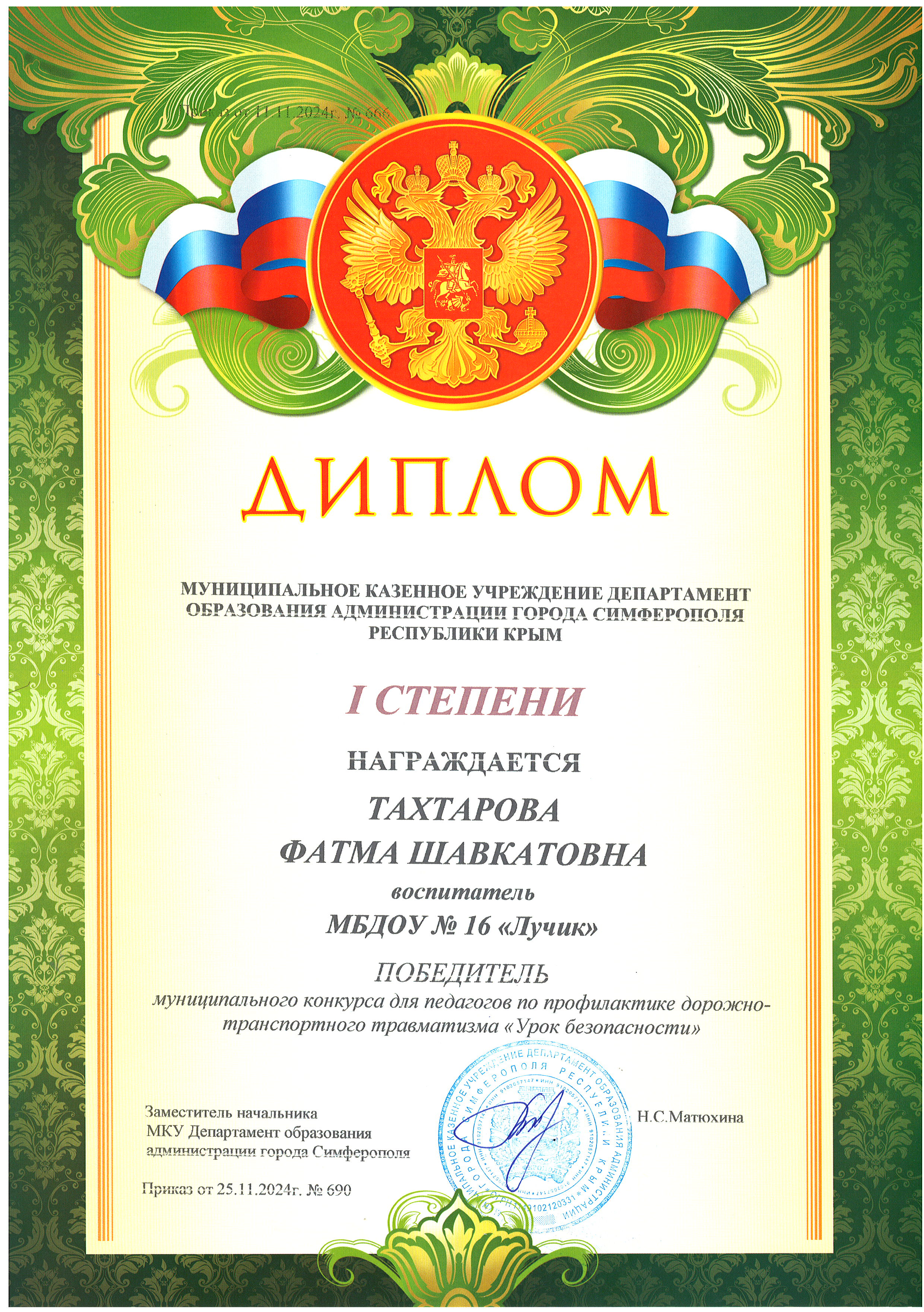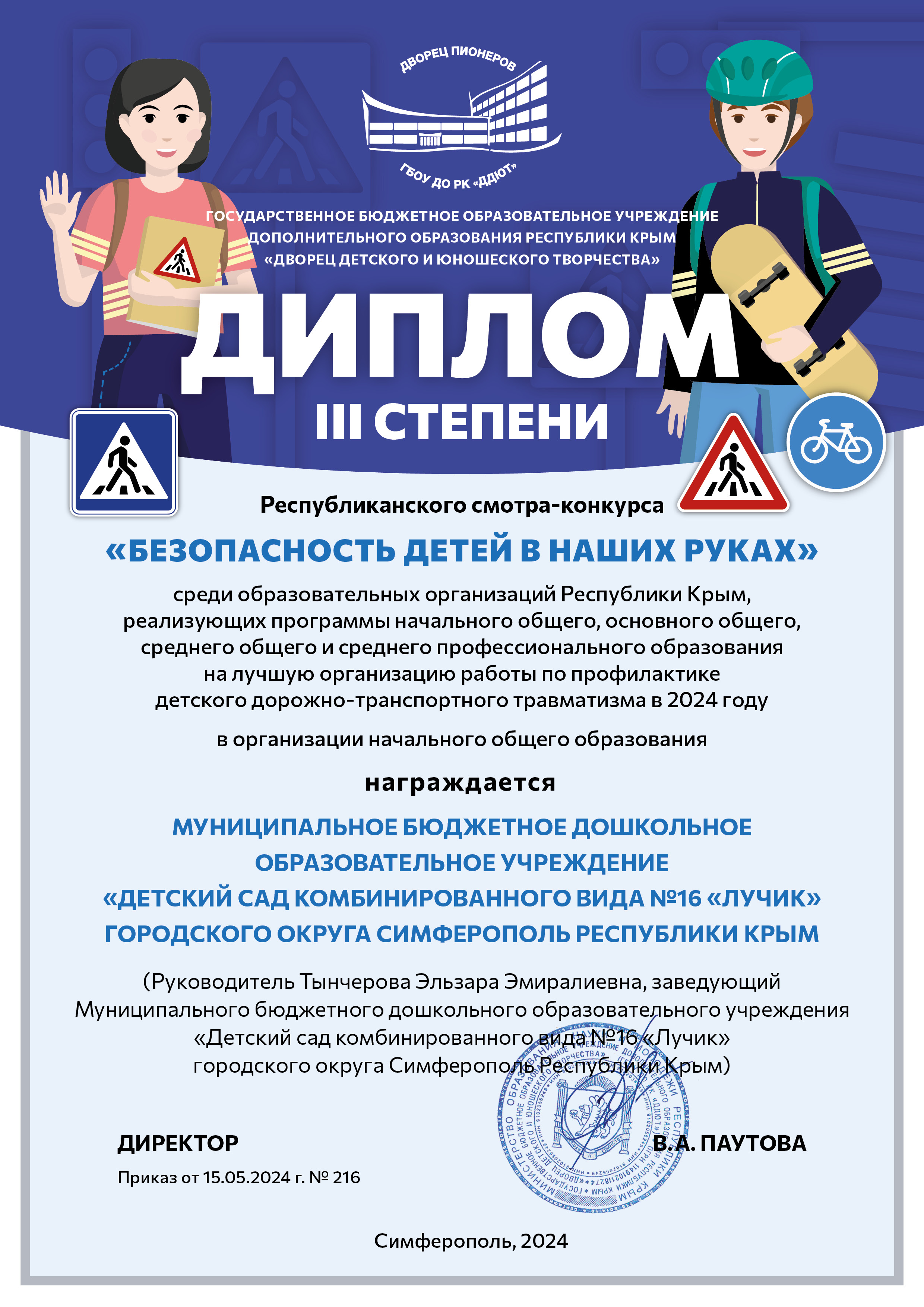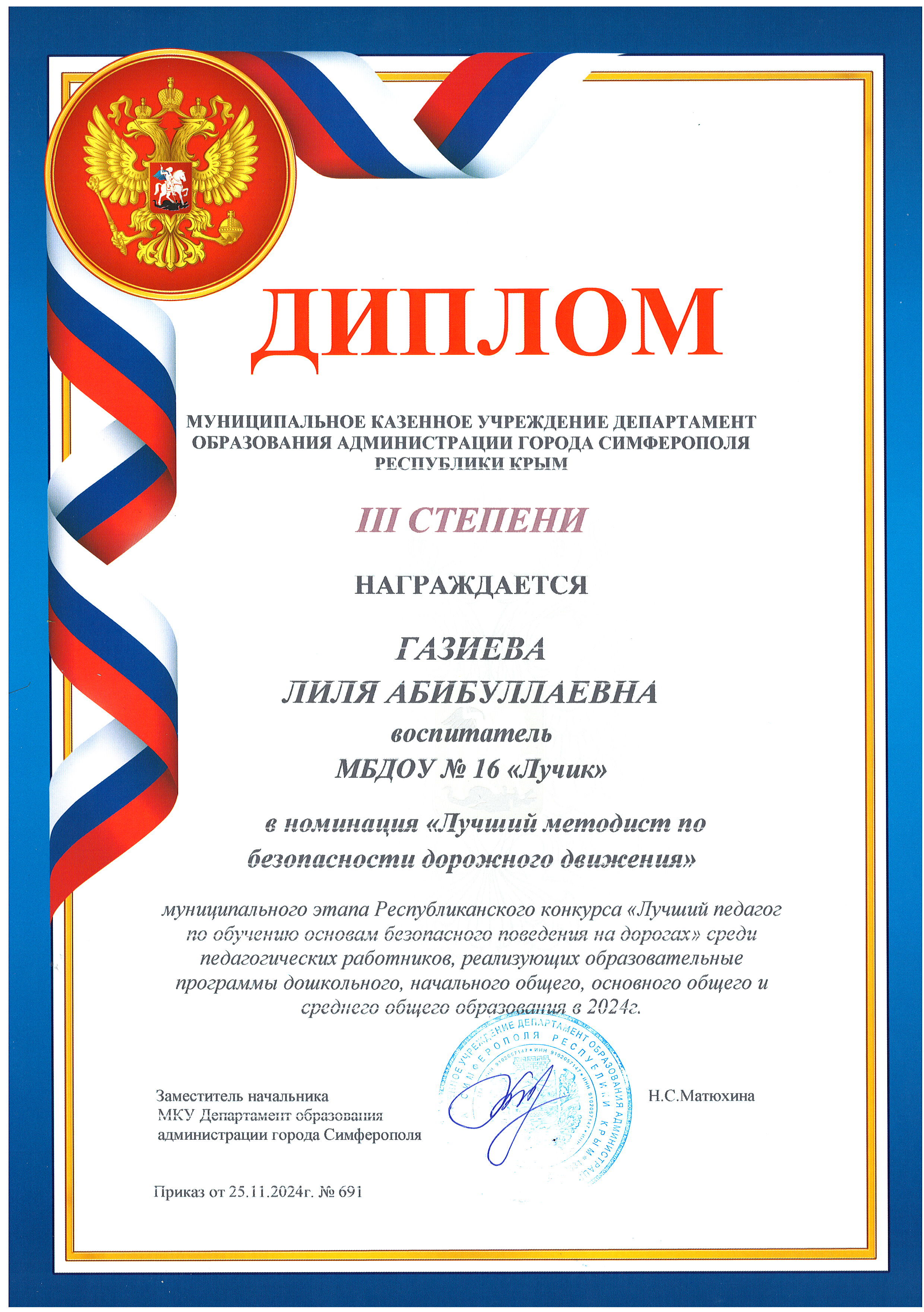 Дипломы Муниципального этапа Республиканского конкурса "Лучший педагог по обучению основам безопасного поведения на дорогах" среди педагогических работников, реализующих образовательные программы дошкольного, начального общего, основного общего и среднего общего образования в 2024 г.