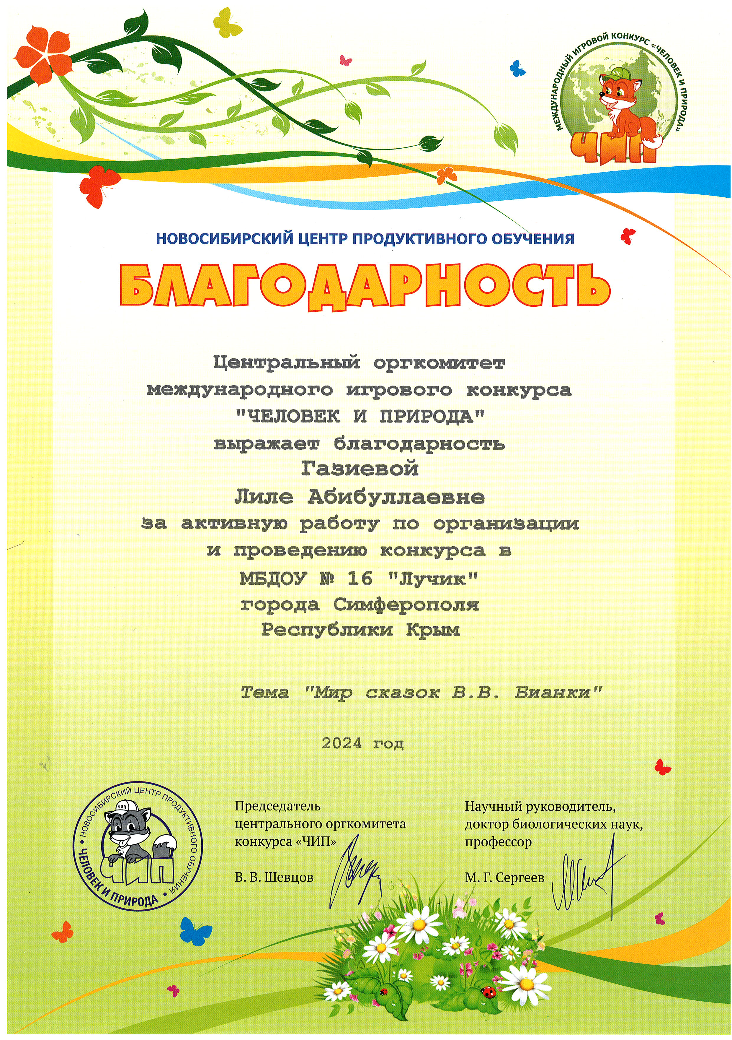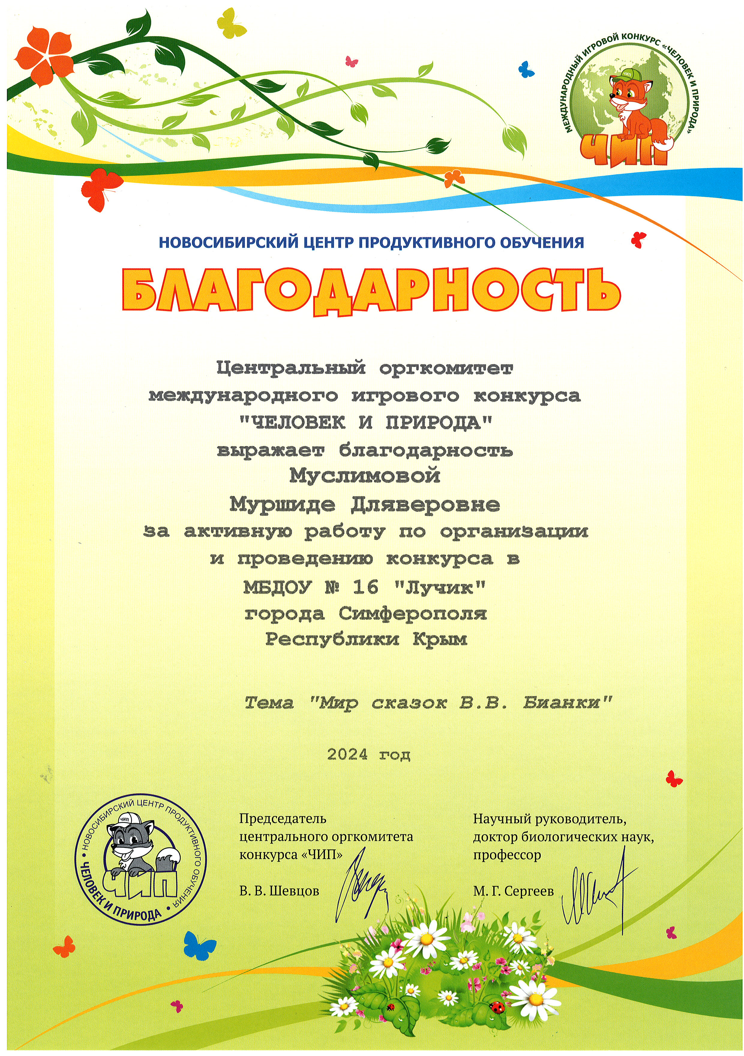 Благодарности за активную работу по организации и проведению международного игрового конкурса "Человек и природа"