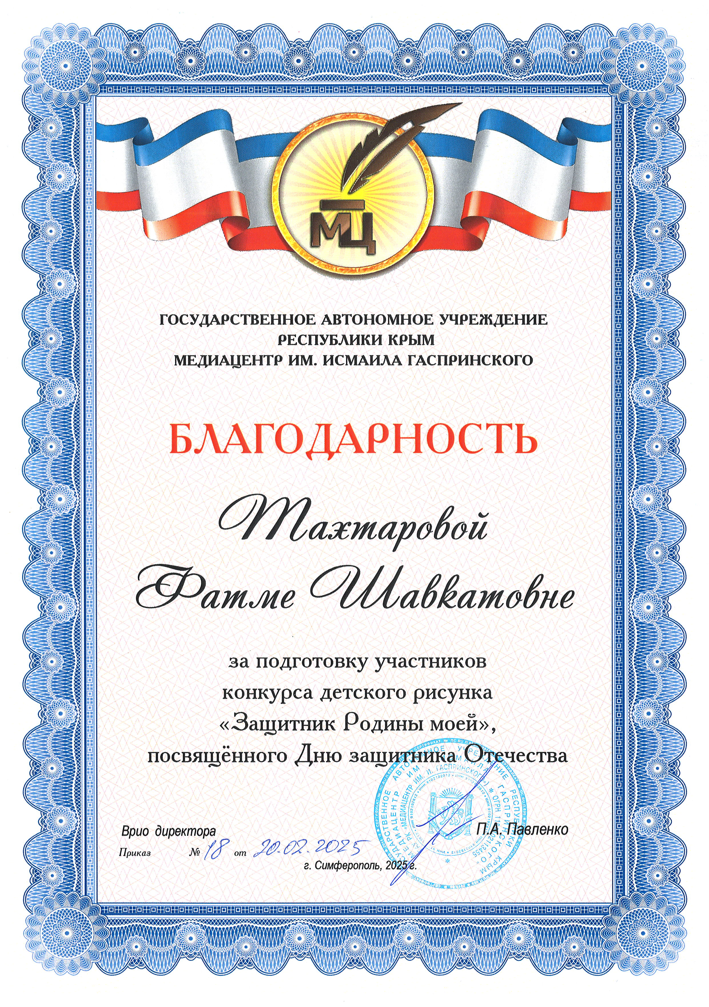 Благодарность за подготовку участников конкурса детского рисунка "Защитник Родины моей", посвященного Дню защитника Отечества