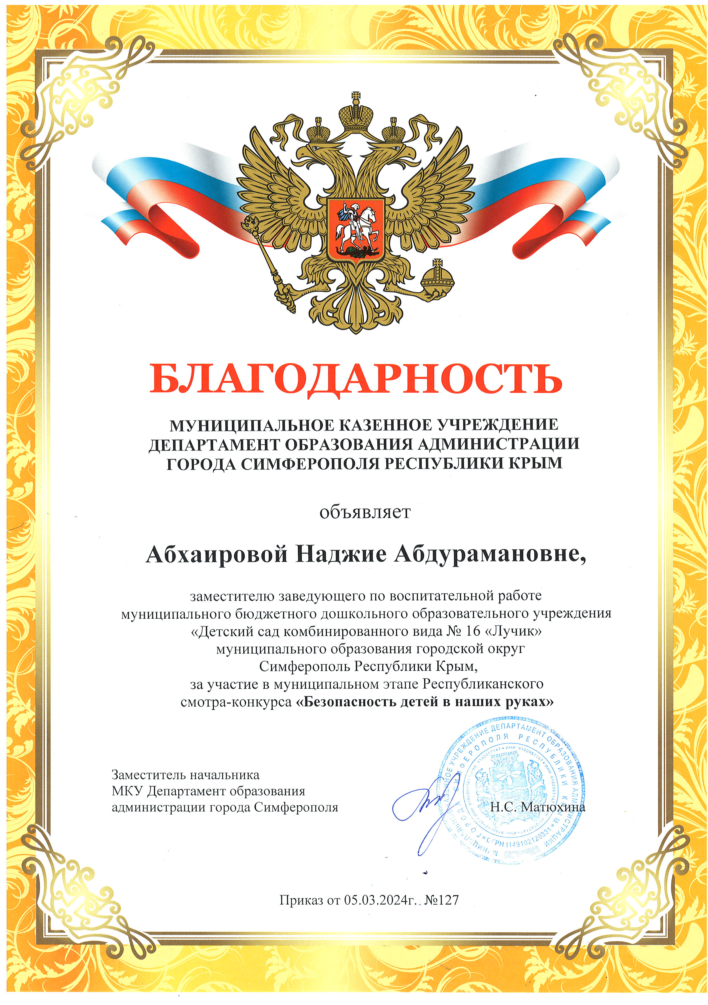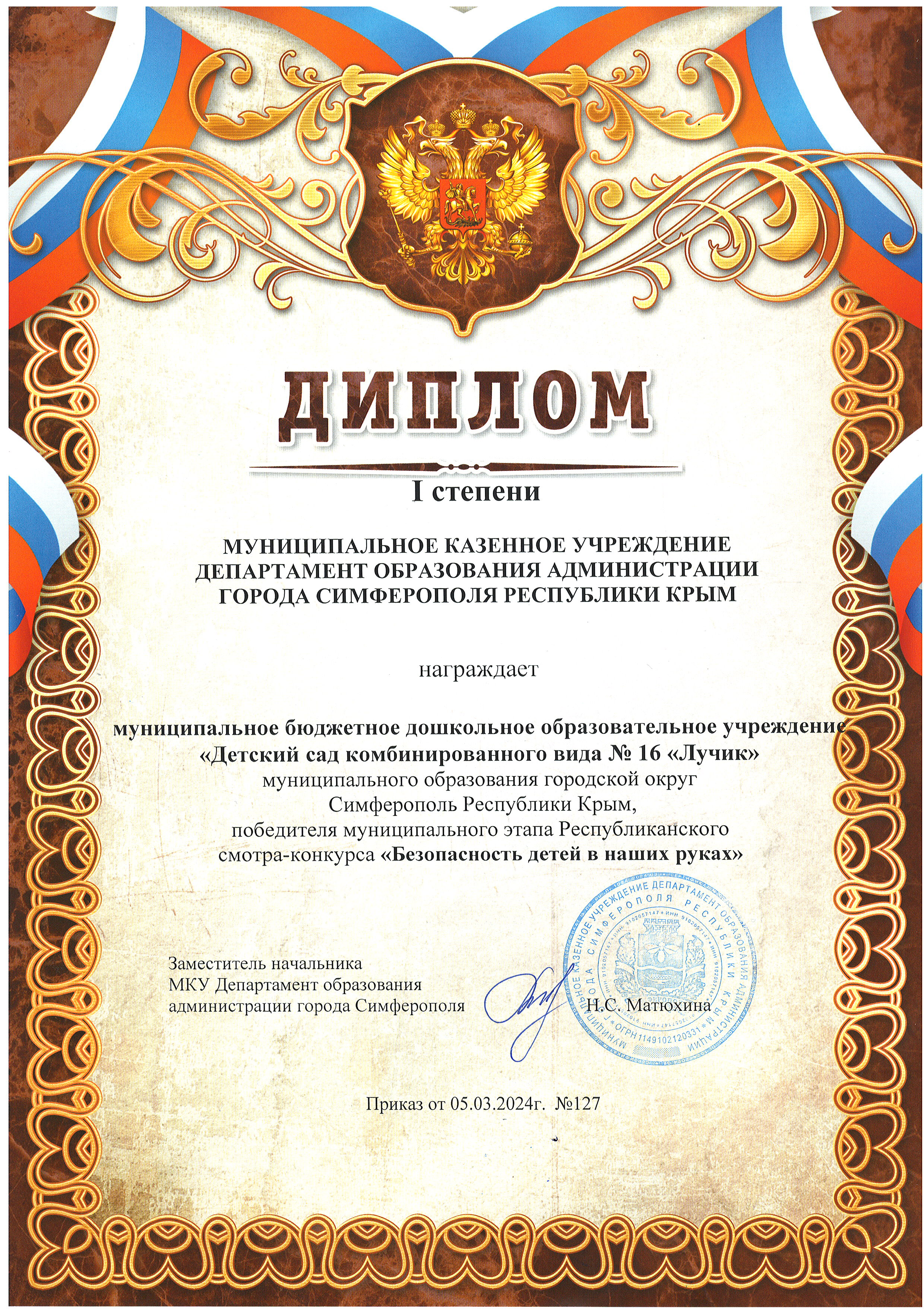 Благодарность и Дипломы за участие в муниципальном этапе Республиканского смотра-конкурса "Безопасность детей в наших руках"