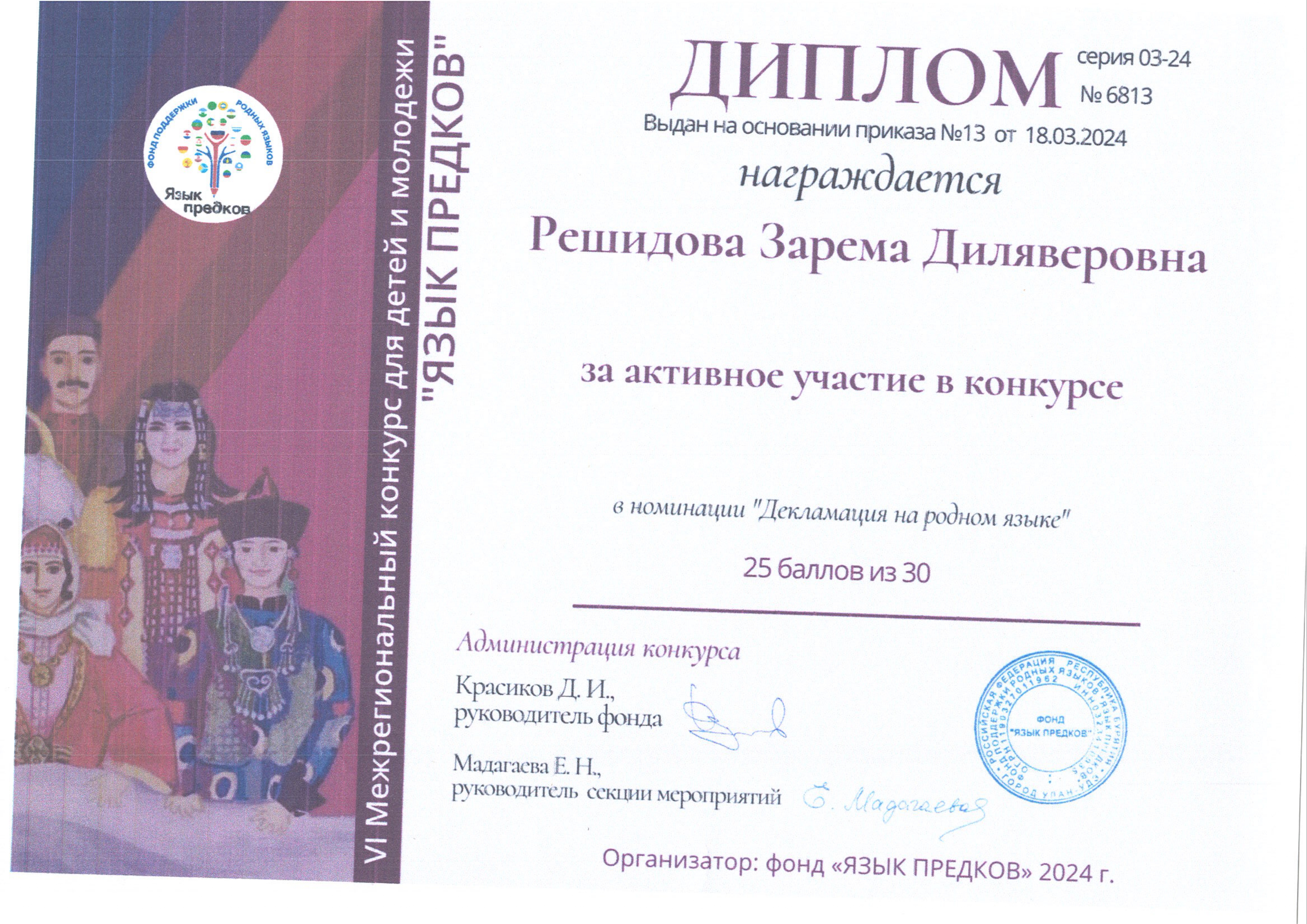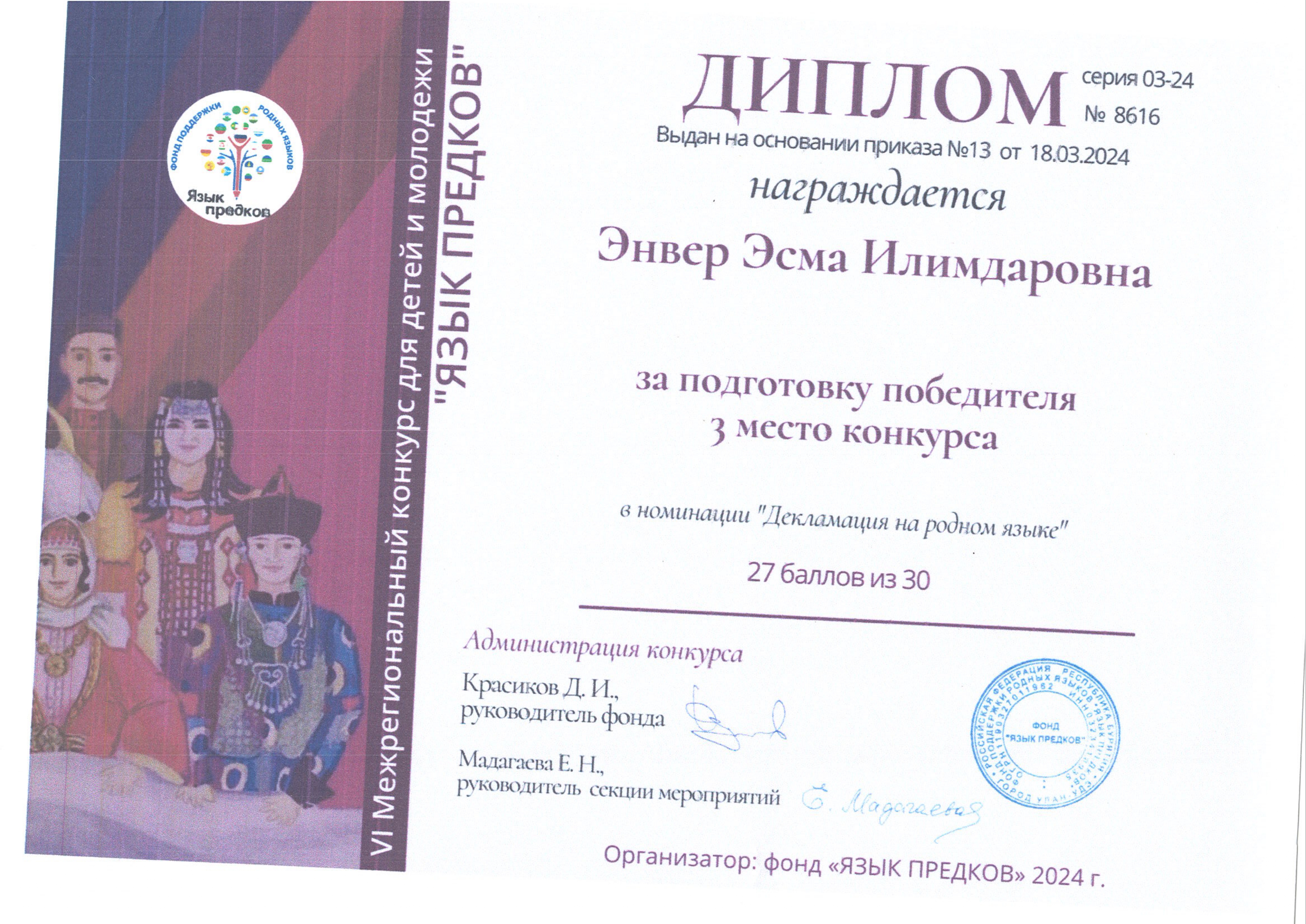Дипломы VI Межрегионального конкурса для детей и молодежи "Язык предков"