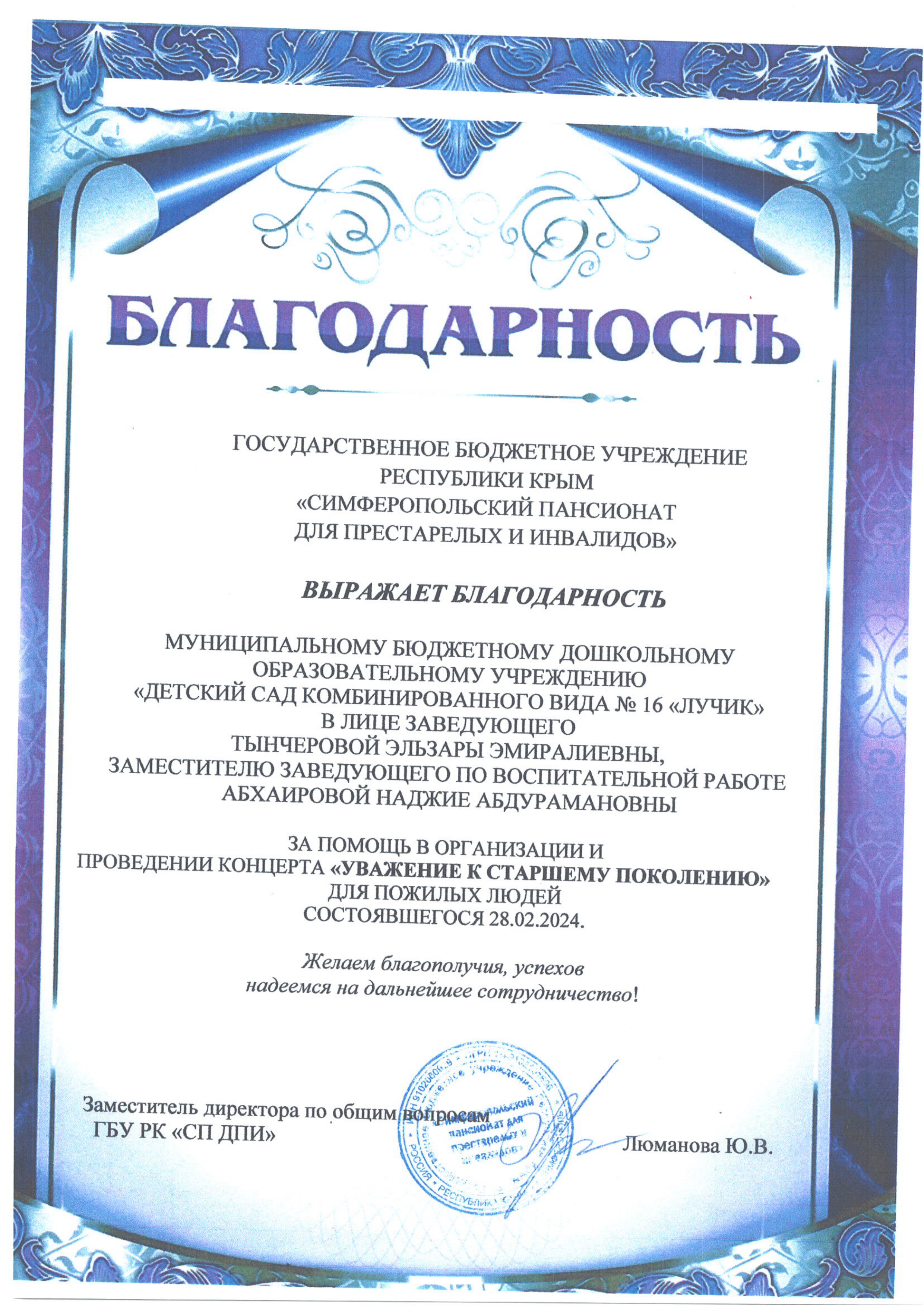 Благодарность за помощь в организации и проведении концерта "Уважение к старшему поколению" для пожилых людей, состоявшегося 28.02.2024 г.