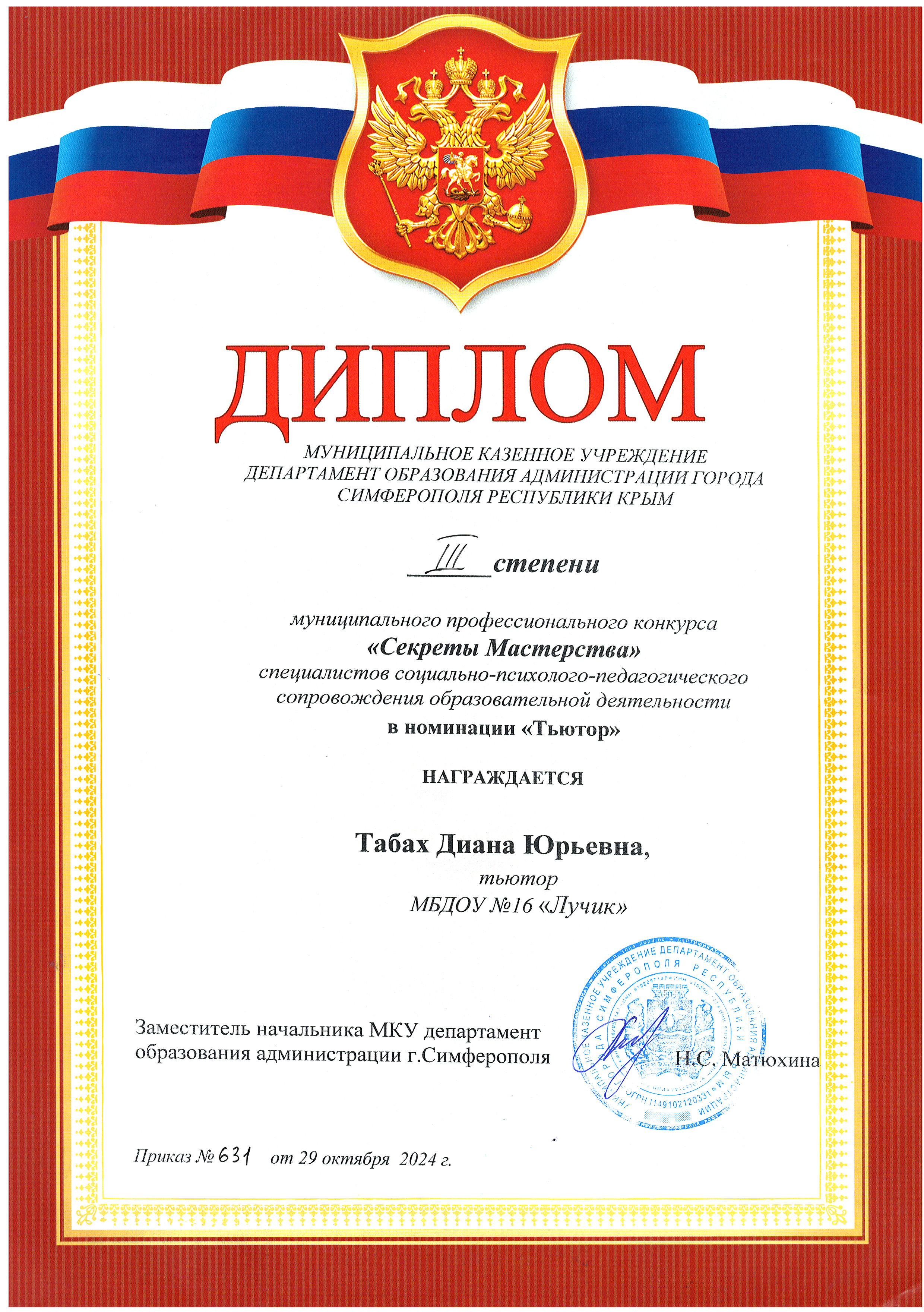 Диплом муниципального профессионального конкурса "Секреты Мастерства" специалистов социально-психолого-педагогического сопровождения образовательной деятельности в номинации "Тьютор"