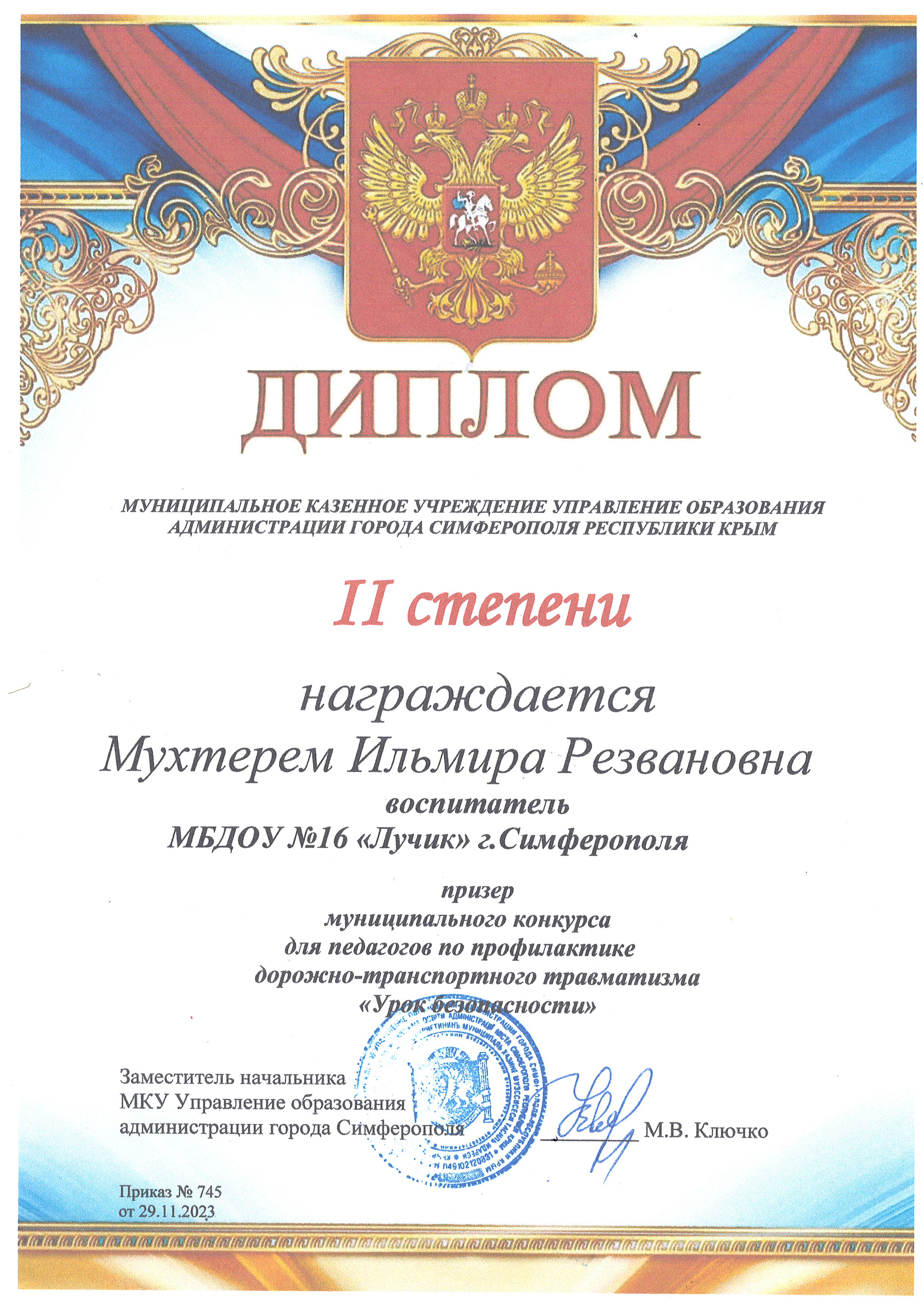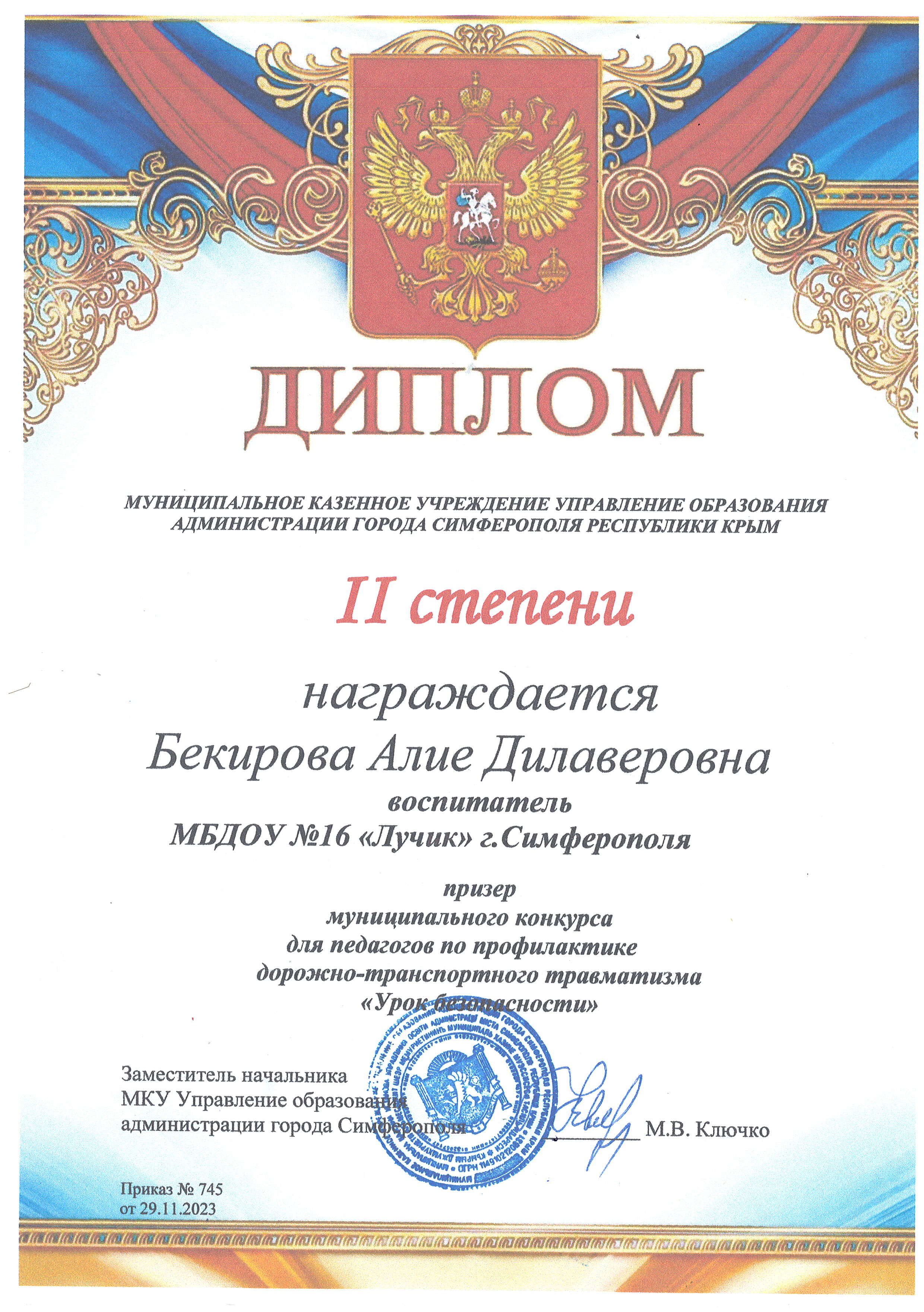 Дипломы Муниципального этапа Республиканского конкурса "Лучший педагог по обучению основам безопасного поведения на дорогах" среди педагогических работников, реализующих образовательные программы дошкольного, начального общего, основного общего и среднего общего образования в 2023 г.