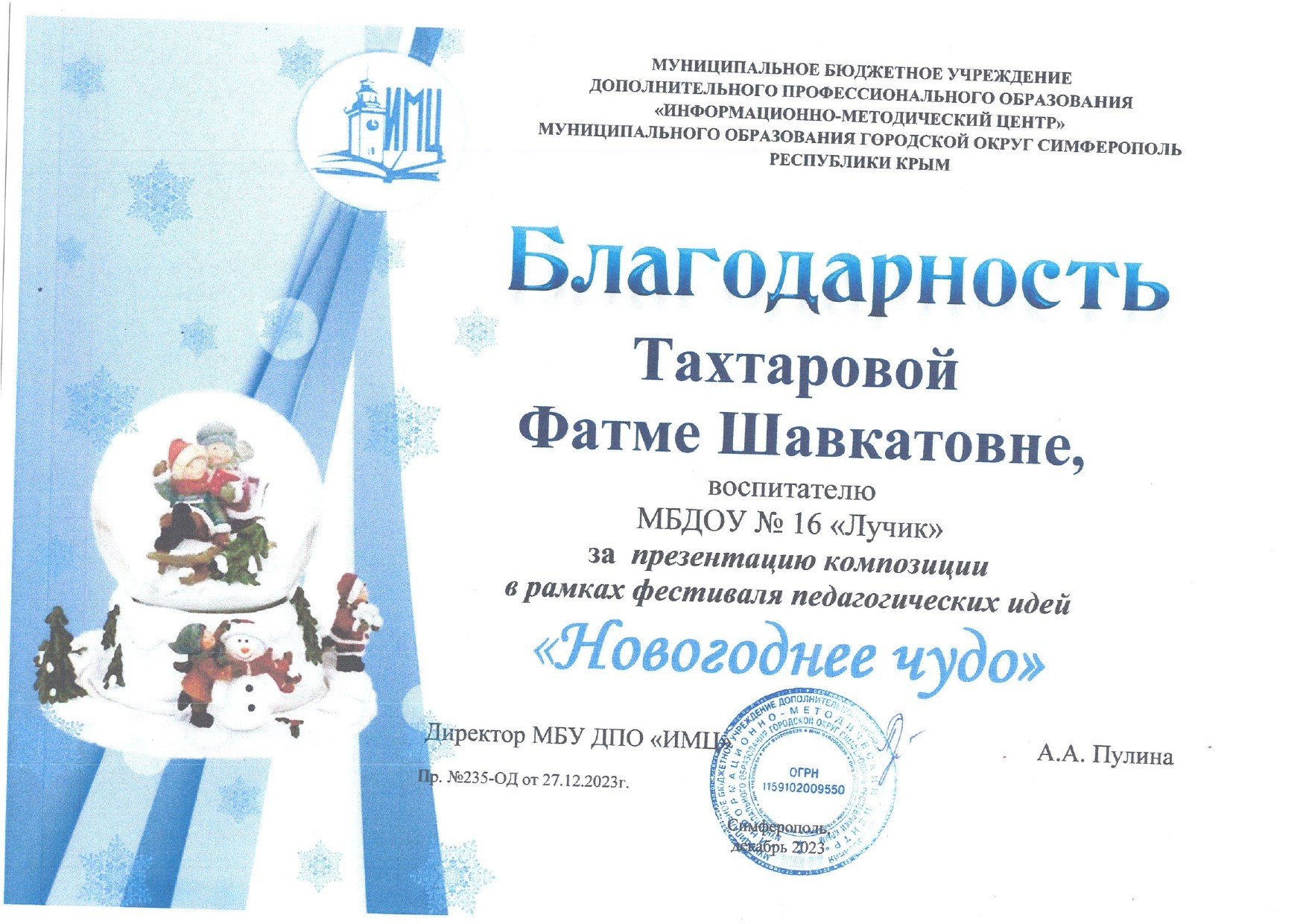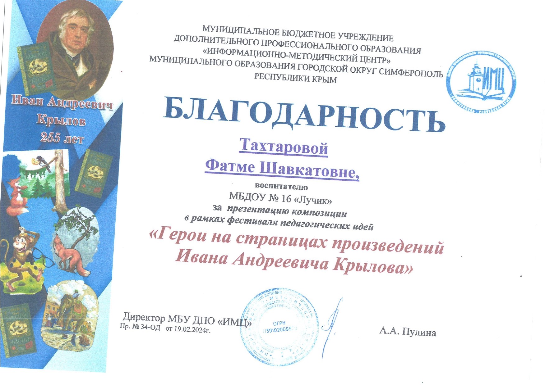 Благодарности за презентацию композиций в рамках фестиваля педагогических идей "Новогоднее чудо" и "Герои на страницах произведений Ивана Андреевича Крылова"
