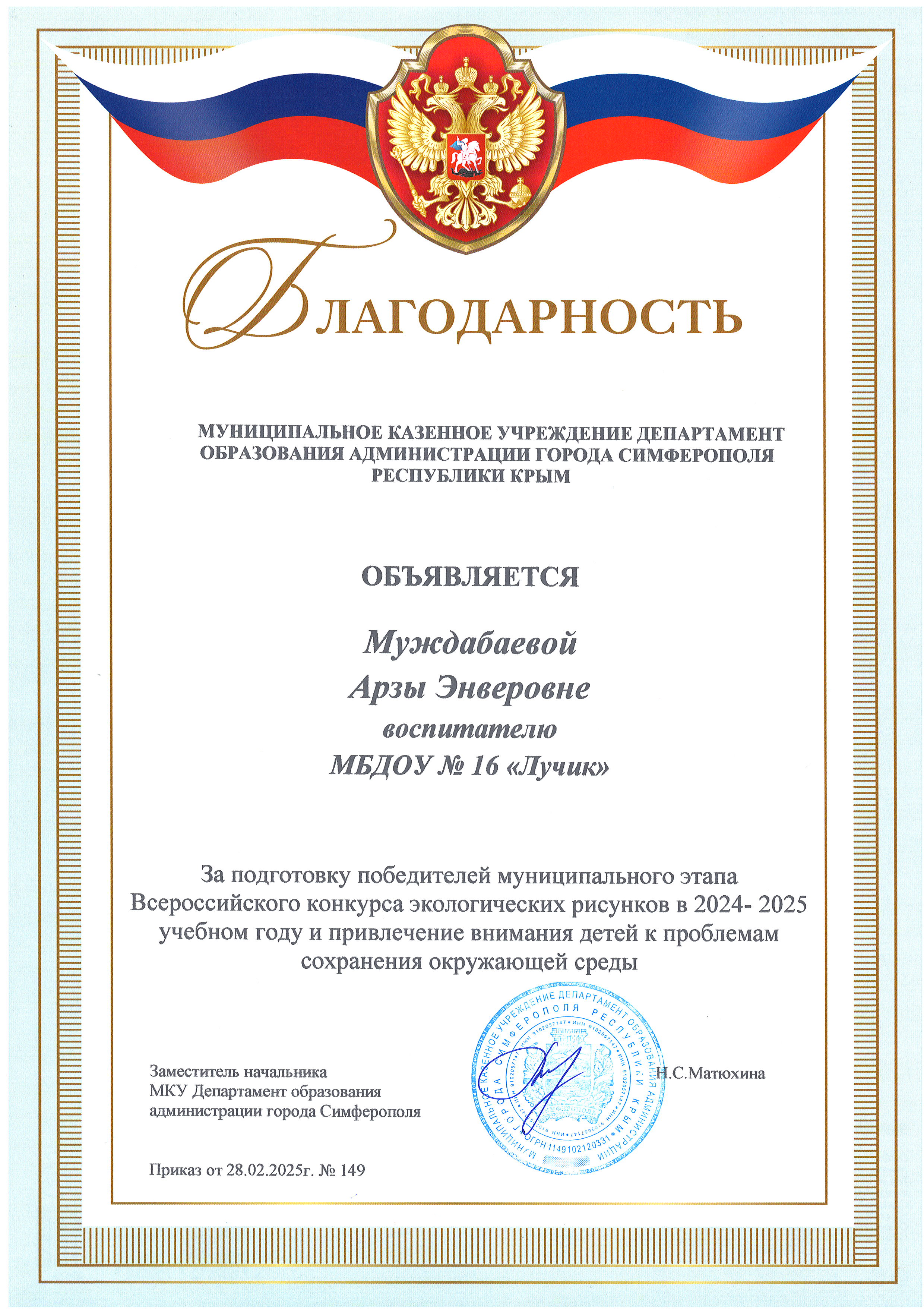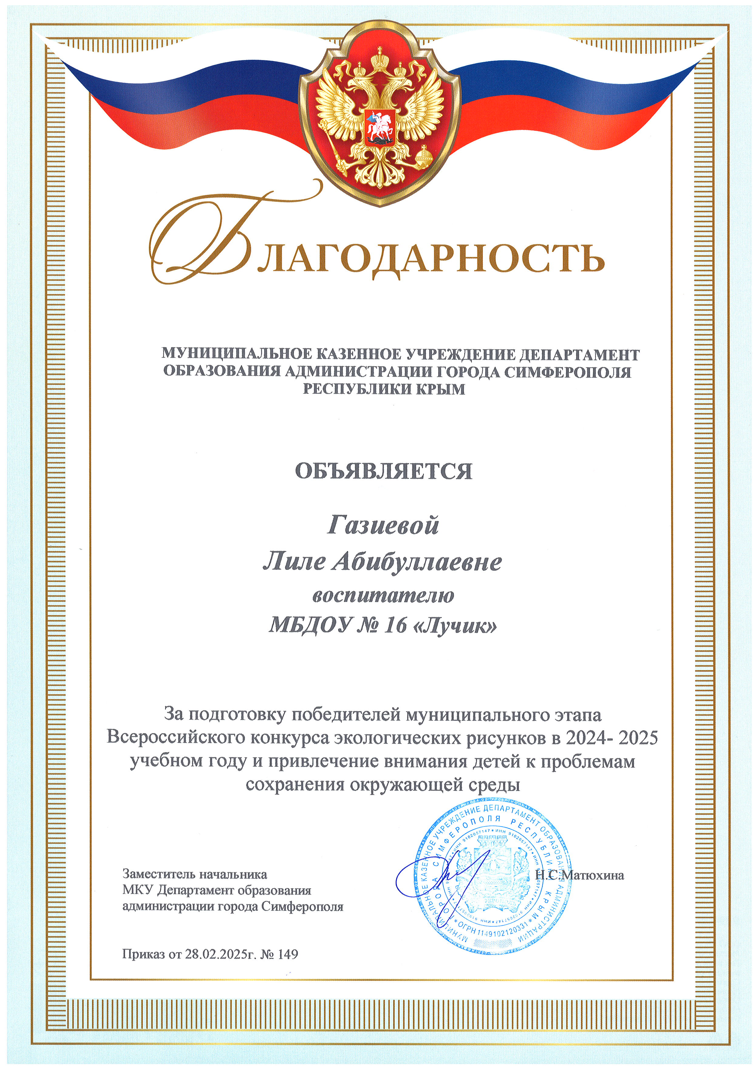 Благодарности за подготовку победителей муниципального этапа Всероссийского конкурса экологических рисунков в 2024-2025 учебном году и привлечение внимания детей к проблемам сохранения окружающей среды