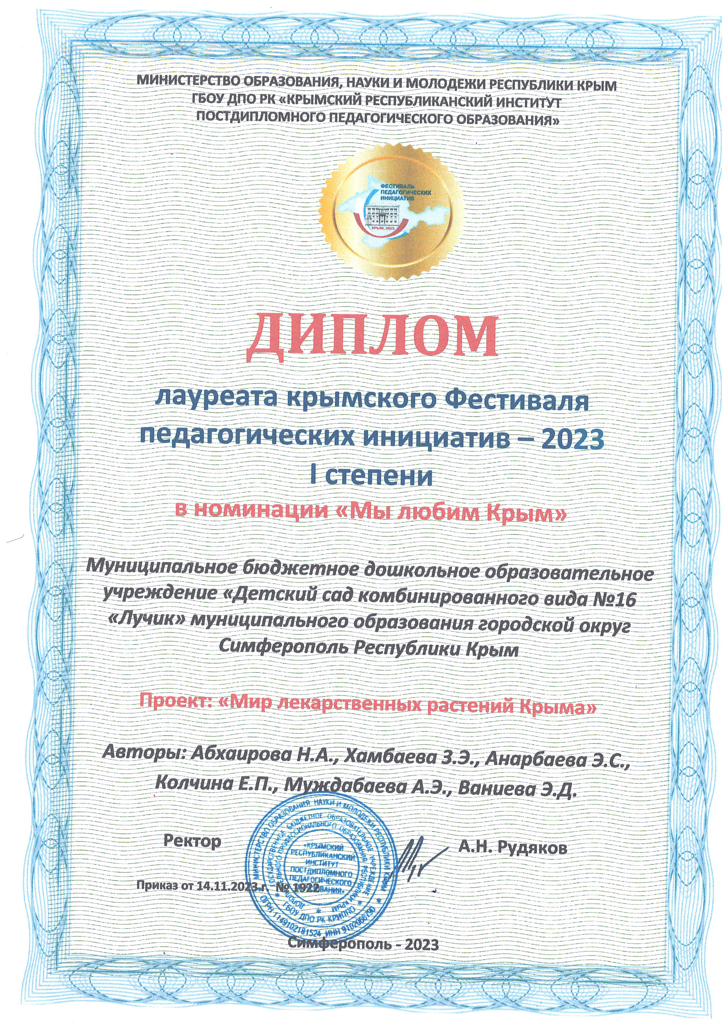 Диплом лауреата крымского Фестиваля педагогических инициатив - 2023 I степени в номинации "Мы любим Крым" в проекте "Мир лекарственных растений Крыма"