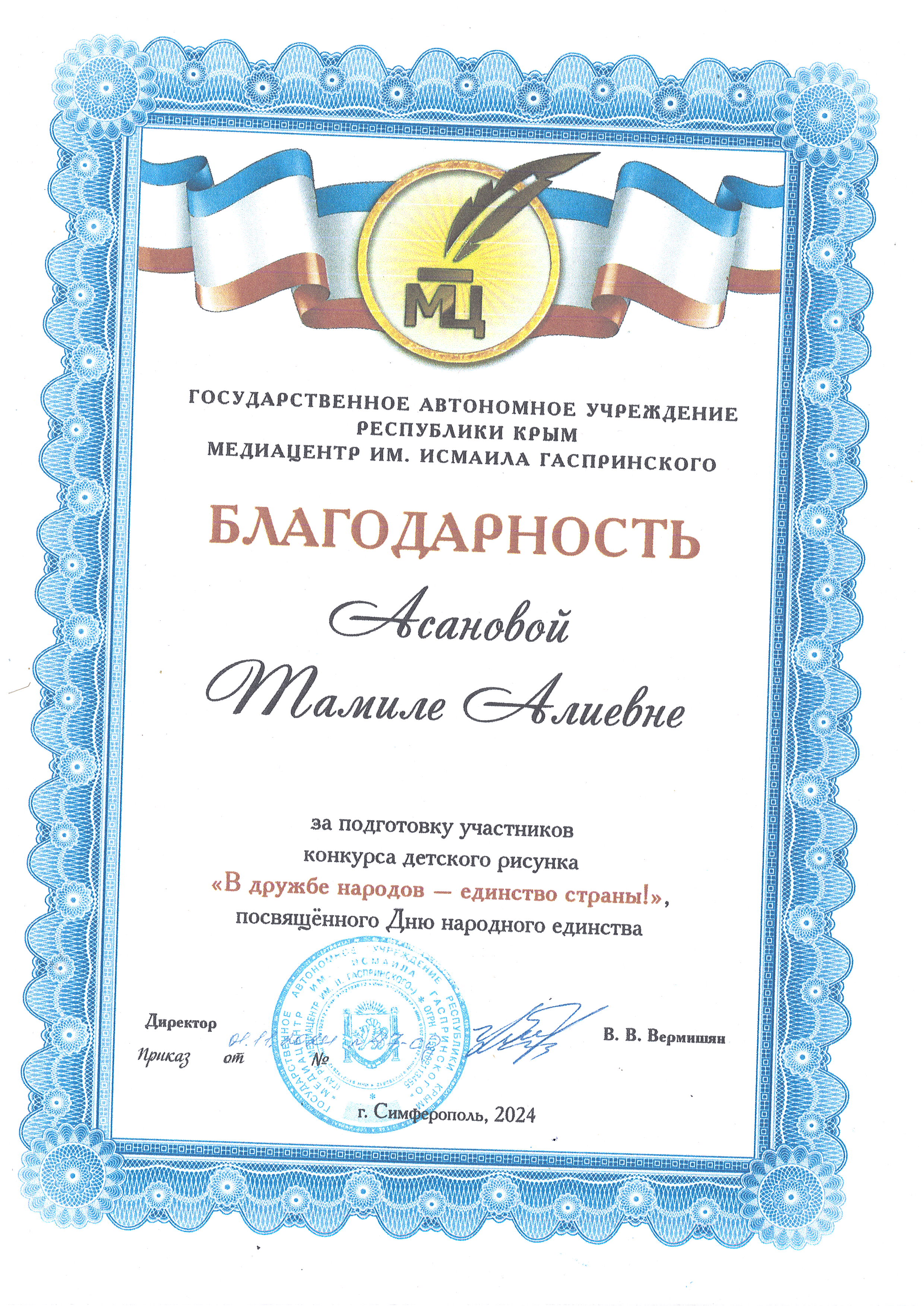 Благодарность за активную работу по подготовке и проведению выставки национальных костюмов народов Крыма "Мы Крымчане! Мы Вместе!"