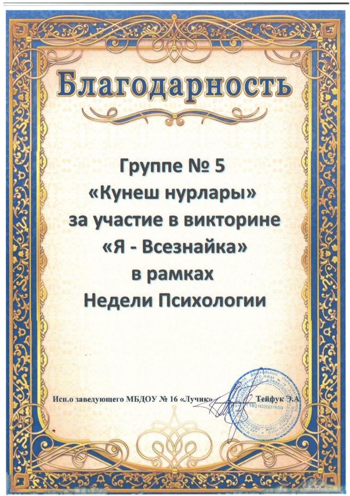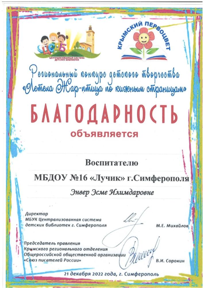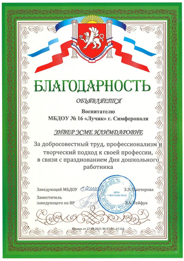 Курсы повышения квалификации: | Удостоверение о повышении квалификации ГБОУ ДПО РК «КРИППО» по программе «Особенности организации работы воспитателя дошкольной образовательной организации в группах с крымскотатарским языком обучения и воспитания», в объеме 36 часов, рег № 7889.,19.09. -23.09. 2022 -удостоверение о повышении квалификации МБУ ДПО «ИМЦ» по программе «Применение ИКТ в профессиональной деятельности педагогического работника», 24 часа. Регистрационный номер №7795, 2024г |