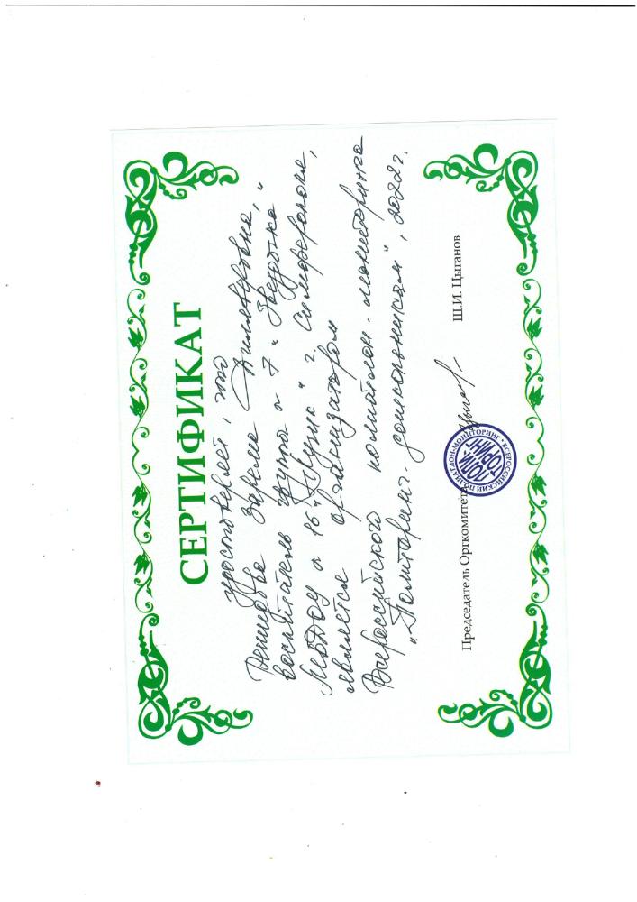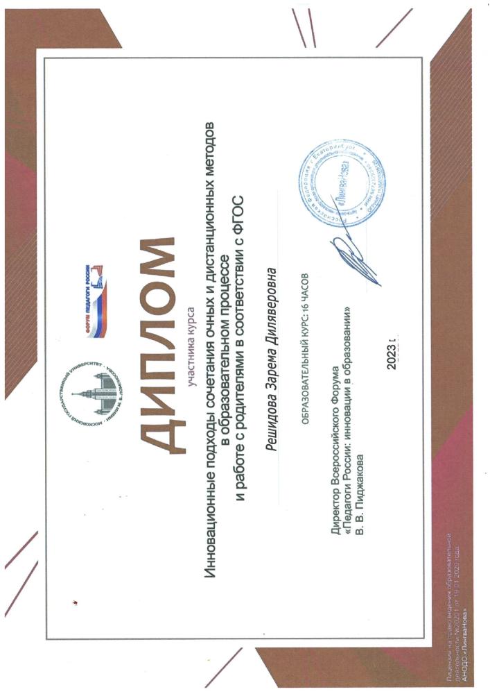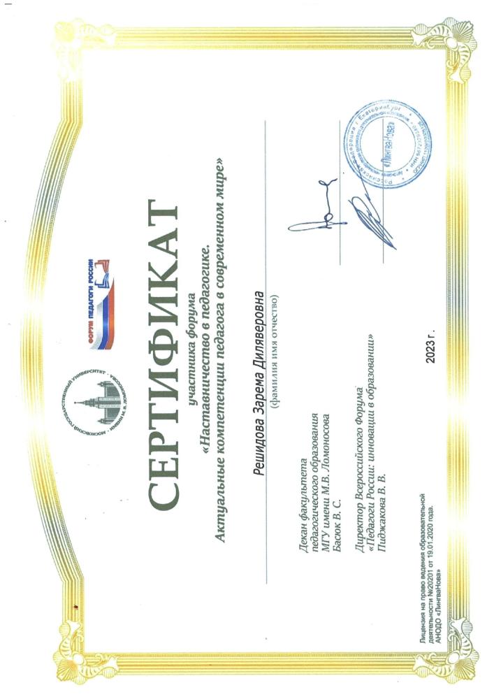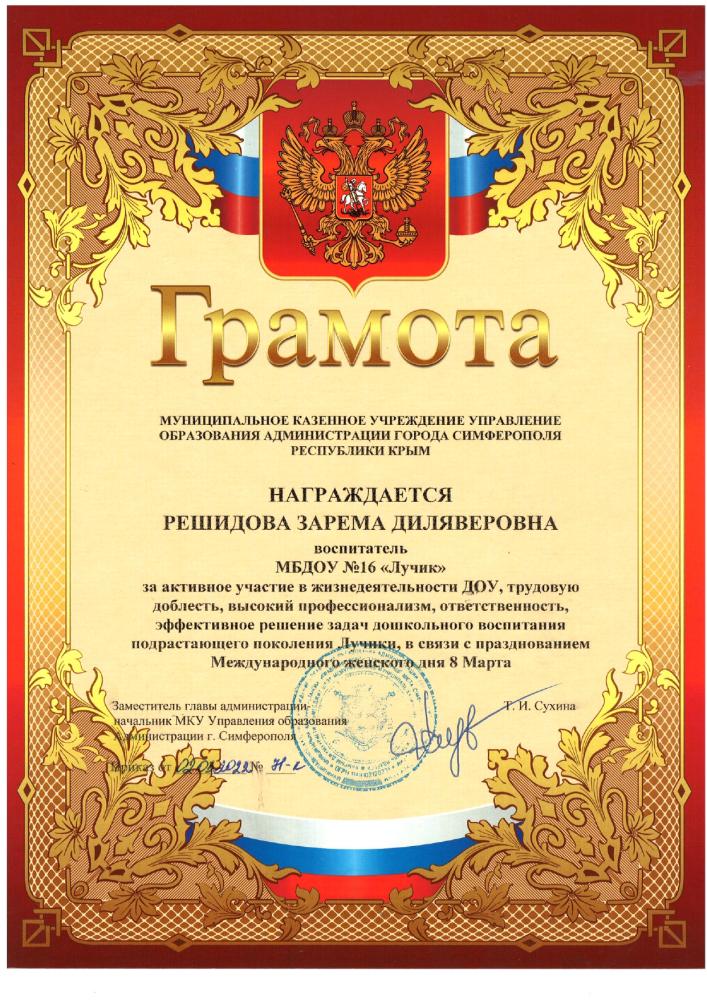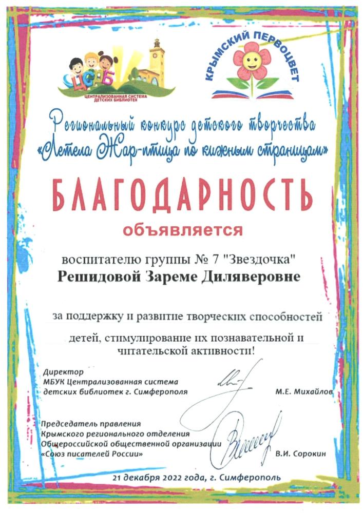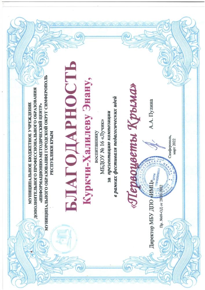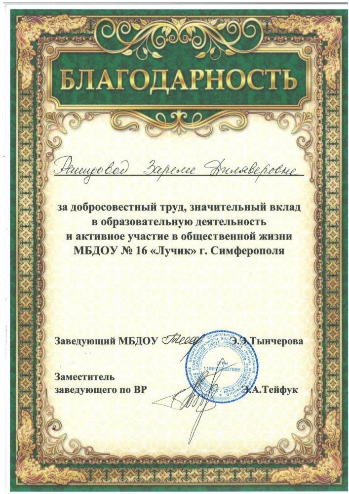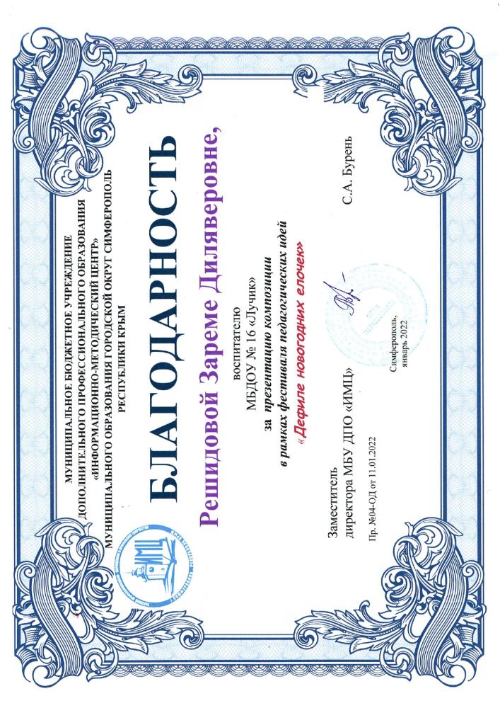Курсы повышения квалификации: | Удостоверение о повышении квалификации ГБОУ ДПО РК «КРИППО» по программе «Формирование профессиональной компетентности и творческого подхода воспитателей ДОО к художественно-эстетическому развитию детей дошкольного возраста» 36 часов, от 05.06..2020 рег № 4731 -Удостоверение о повышении квалификации ГБОУ ДПО РК «КРИППО» по программе «Особенности организации работы воспитателя дошкольной образовательной организации в группах с крымскотатарским языком обучения и воспитания» 36 часов, от 10.02.2023 рег № 1152 -удостоверение о повышении квалификации МБУ ДПО «ИМЦ» по программе «Применение ИКТ в профессиональной деятельности педагогического работника», 24 часа. Регистрационный номер №7792, 2024г |